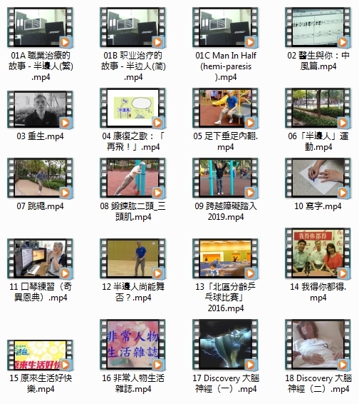 本人最近把我過去多年有關中風康復的電視訪問、電台訪問、康復運動示範、康復之歌:「再飛!」、跳繩、跳舞、寫字、乒乓球比賽…等視頻整理,並壓縮成每個視頻不足20MB,方便以WhatsApp或微信(WeChat)分享。全部共20個視頻(共238MB)(圖片),大家可下載以下壓縮檔到手機或電腦內,經解壓後便可在手機或電腦上觀看,也可以WhatsApp和微信分享給有需要人士。希望我的視頻可為中風病友和家屬,提供多一點有關康復的資訊,助他們踏上康復之路! |